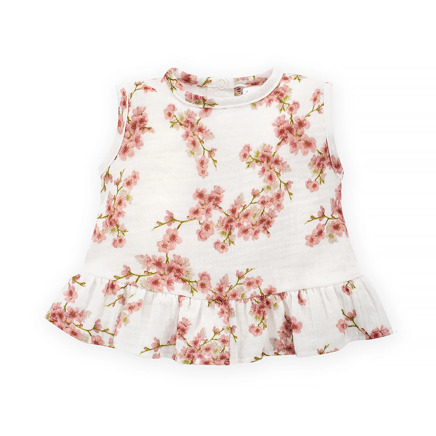 Bluzeczka ozdobiona jest subtelnym printem gałązek z różowymi kwiatuszkami, który nawiązuje do letniego klimatu kolekcji i dodaje jej dziewczęcego uroku. Dół bluzeczki wykończono uroczą, marszczoną falbanką, która nadaje całości lekkości oraz elegancji, idealnej na letnie spacery, rodzinne spotkania oraz codzienne stylizacje.