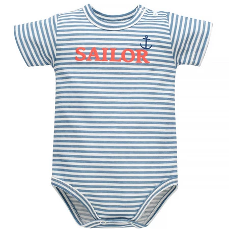 Na przodzie body znajduje się nadruk napisu „sailor” oraz kotwicy, wykonany bezpiecznymi farbami wodnymi, odpornymi na codzienne użytkowanie i częste pranie, co gwarantuje trwałość i estetyczny wygląd ubranka przez długi czas.