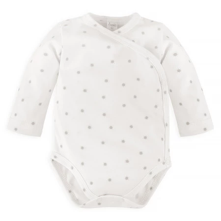 Delikatny kolor ecru z uroczym nadrukiem słoneczek wprowadza radosny nastrój i pasuje zarówno do chłopięcych, jak i dziewczęcych stylizacji. Dzięki kopertowemu krojowi i zapięciu na bezniklowe napki, body jest niezwykle łatwe w zakładaniu i zdejmowaniu – idealne dla noworodków.
