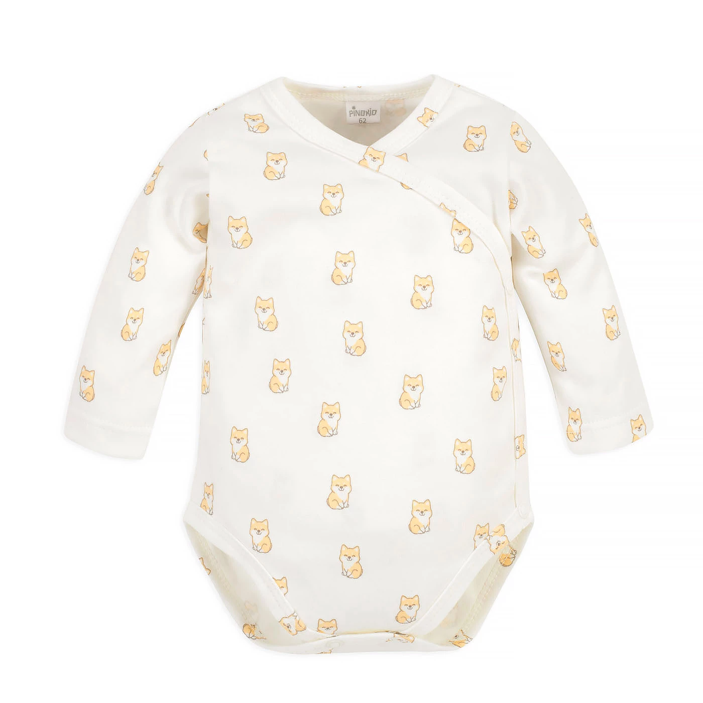 Model w kolorze ecru z nadrukiem w pieski, wykonanym trwałymi i bezpiecznymi farbami wodnymi, świetnie sprawdzi się zarówno jako ubranko codzienne, jak i jako element wyprawki. Kopertowy krój to doskonały wybór dla noworodków – ułatwia przebieranie bez konieczności zakładania przez główkę.