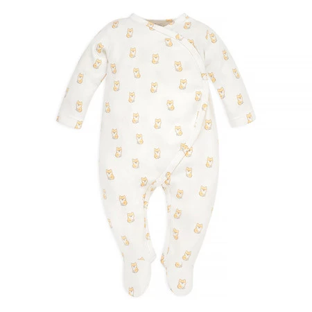 Subtelny wzór w pieski i neutralny odcień ecru czynią ten pajacyk idealnym wyborem zarówno dla dziewczynki, jak i chłopca.