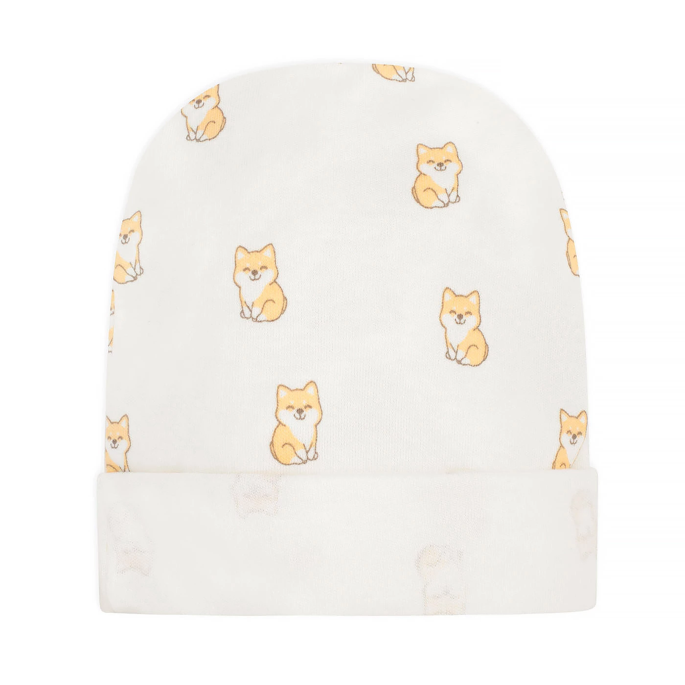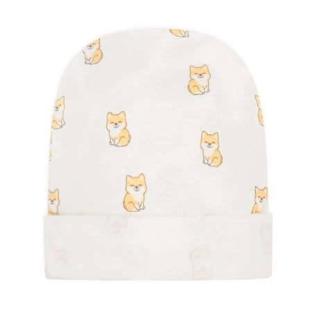 Delikatny wzór w pieski na tle ecru nadaje czapeczce subtelny, dziecięcy charakter – idealna dla chłopców i dziewczynek już od pierwszych dni życia.