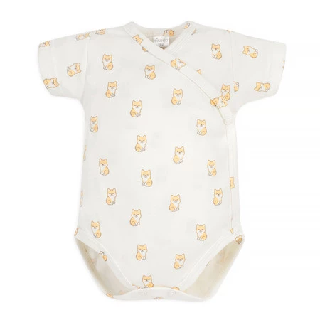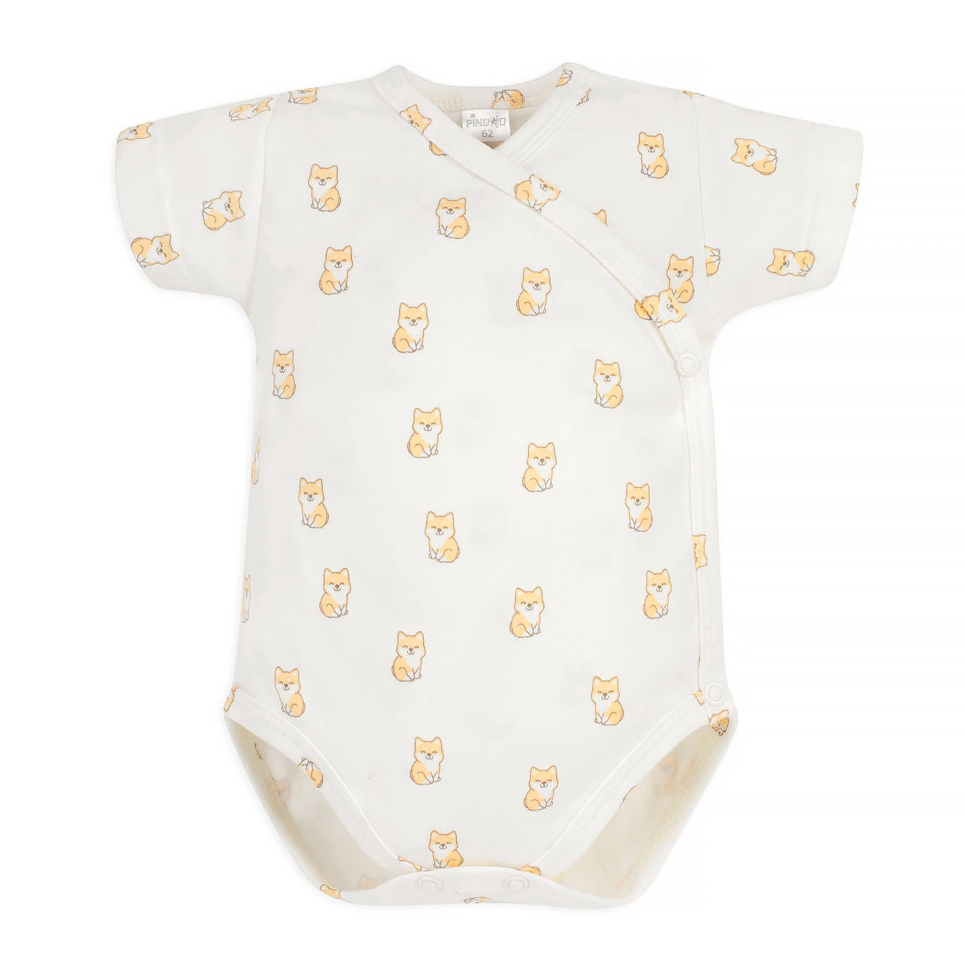 Kopertowy krój ułatwia zakładanie i zdejmowanie ubranka bez potrzeby przekładania przez główkę – co jest szczególnie ważne w pielęgnacji noworodków. Uroczy print w pieski na tle ecru nadaje body dziecięcego uroku, a bezniklowe napy i miękka lamówka zapewniają bezpieczne i wygodne użytkowanie.