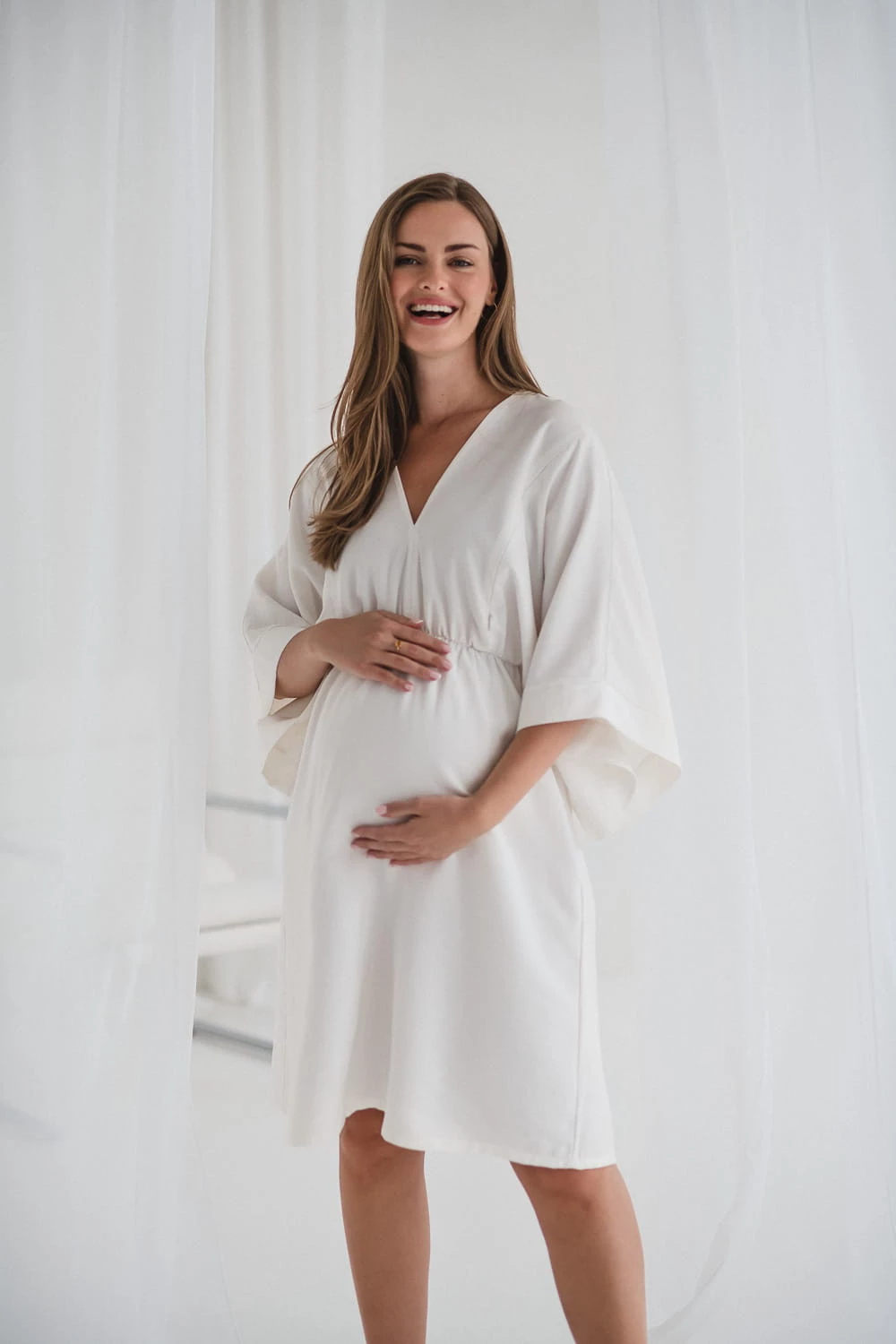 Po porodzie sukienka staje się praktyczną sukienką do karmienia piersią. Dwa zamki wszyte w boczne szwy pozwalają na szybki i dyskretny dostęp do piersi, dzięki czemu możesz komfortowo nakarmić dziecko w każdej sytuacji, nie rezygnując z estetyki i wygody.