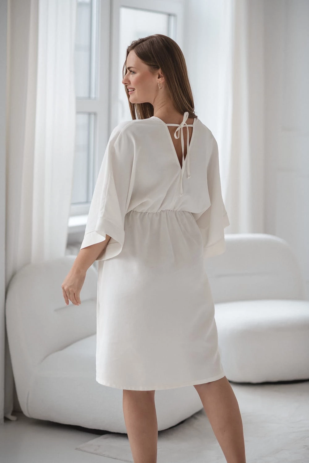 Mama Zen to sukienka ciążowa o luźnym kroju kimono, który pięknie układa się na sylwetce w ciąży i zapewnia swobodę ruchów. Szerokie rękawy oraz dekolt V-neck z przodu i z tyłu z wiązaniem na karku nadają sukience subtelnej elegancji i orientalnego charakteru.