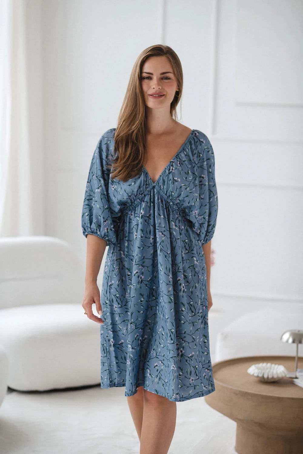 Krój sukienki został zaprojektowany tak, aby zmieścił rosnący brzuszek nawet w 9. miesiącu, jednocześnie pięknie układając się na sylwetce. Bufiaste rękawy nadają jej lekkości i romantycznego stylu, a dekolt V z przodu i na plecach subtelnie podkreśla figurę.