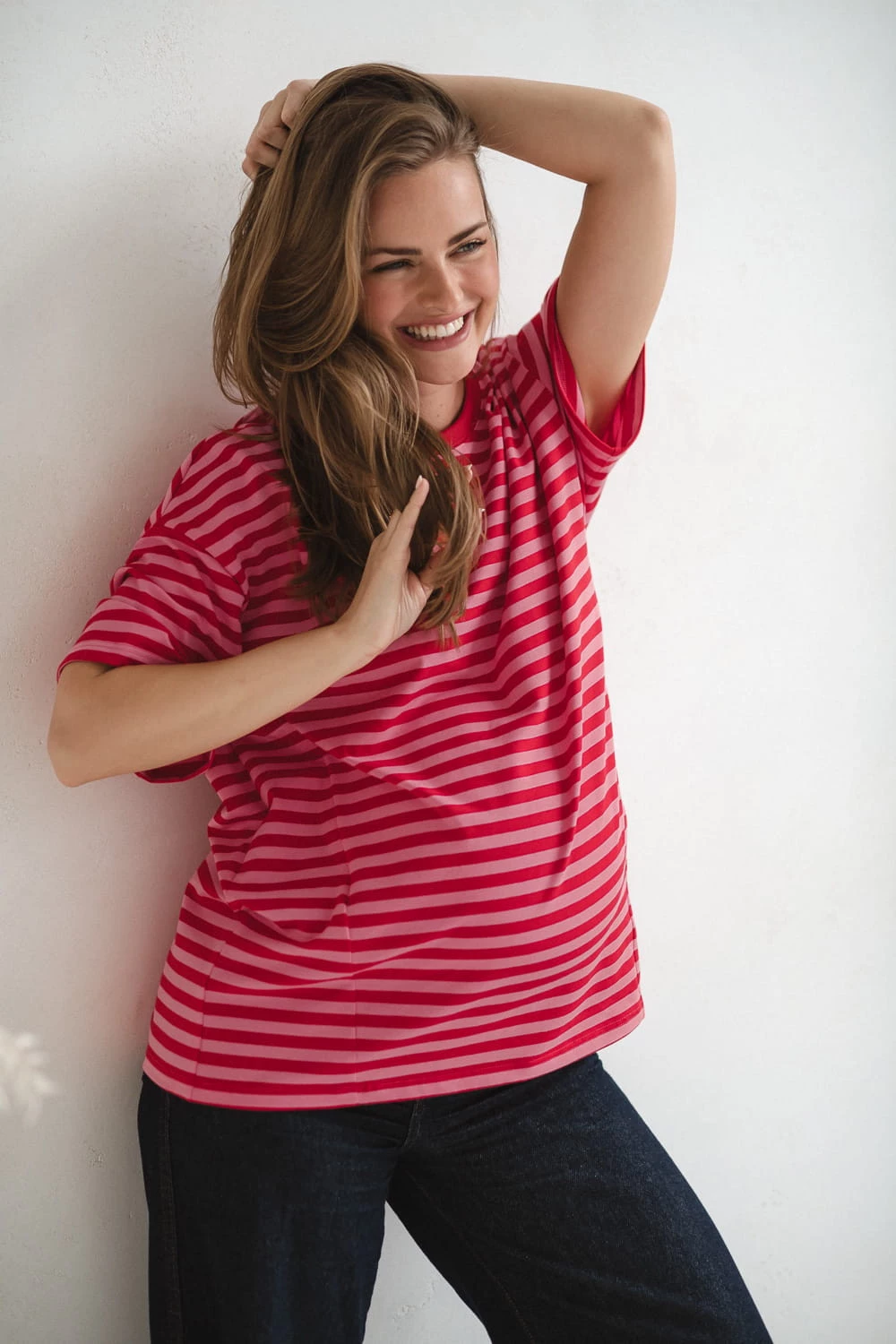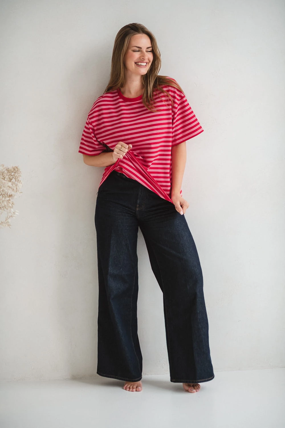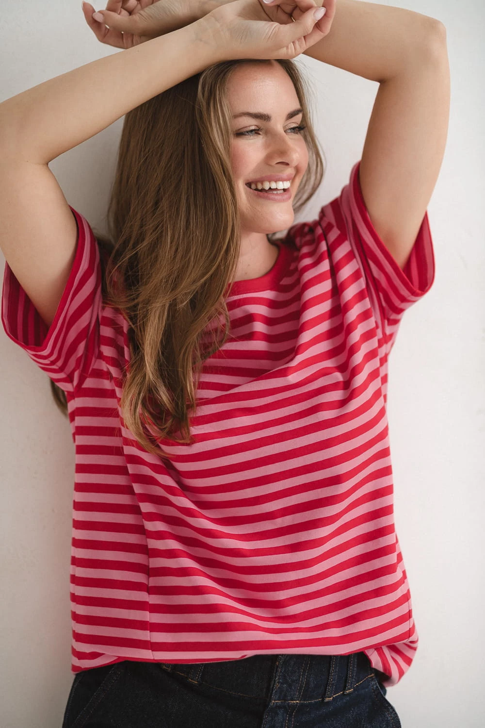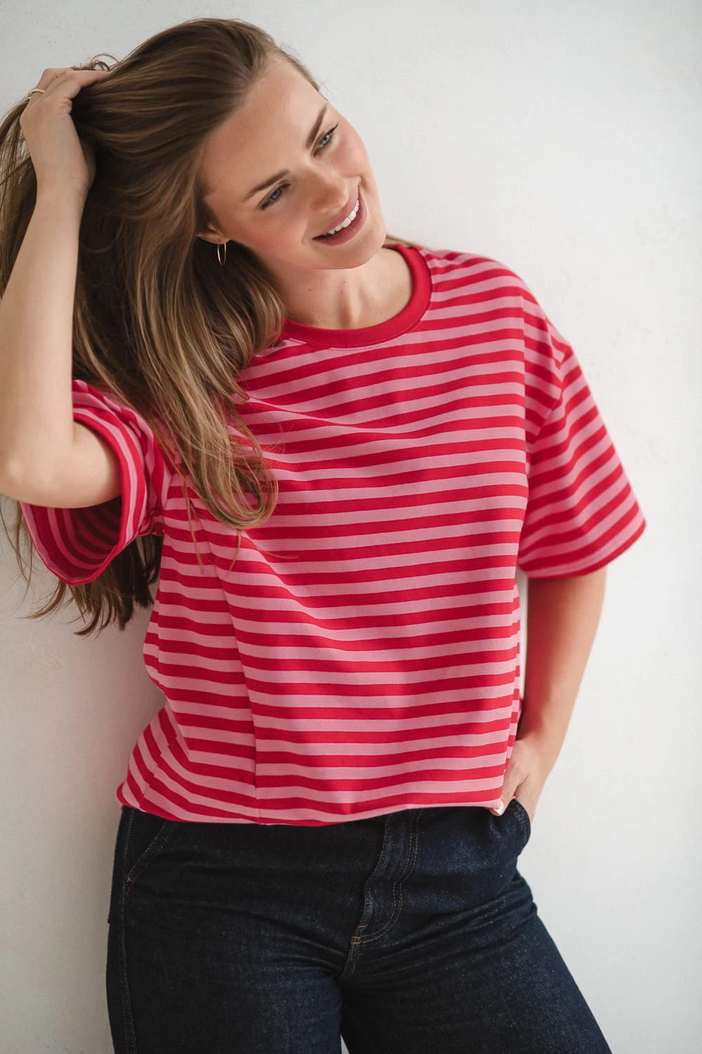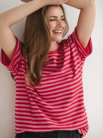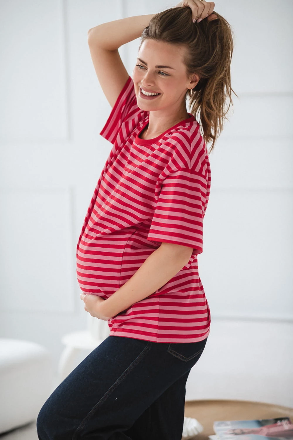 Nowoczesne połączenie czerwono-różowe pasków sprawia, że nasza koszulka ciążowa do karmienia wygląda modnie i świeżo. To ubranie ciążowe, w którym poczujesz się atrakcyjnie zarówno w domu, jak i podczas codziennych wyjść.