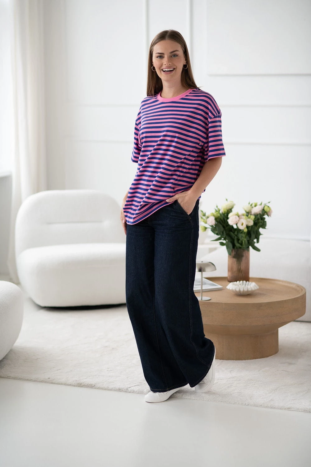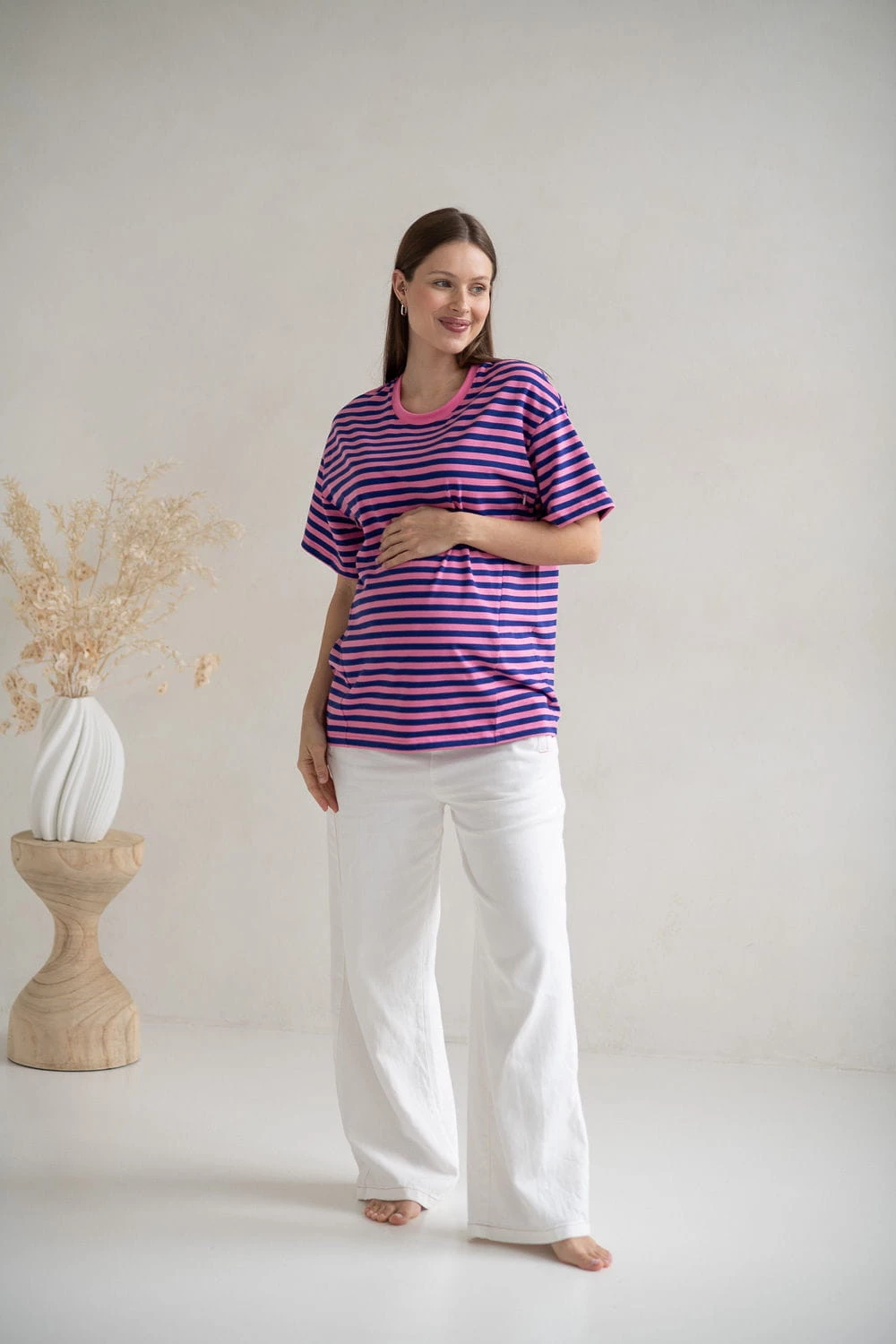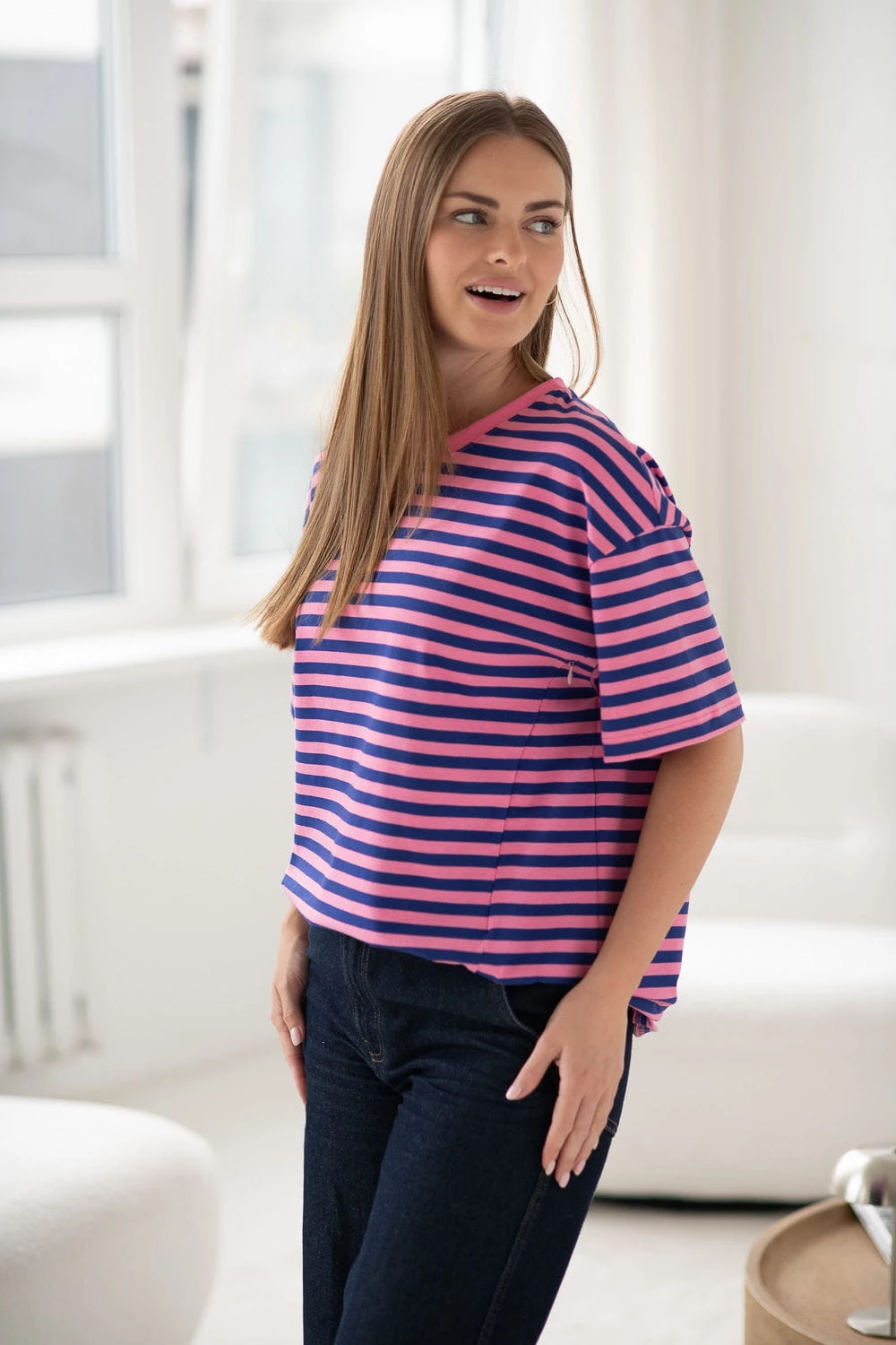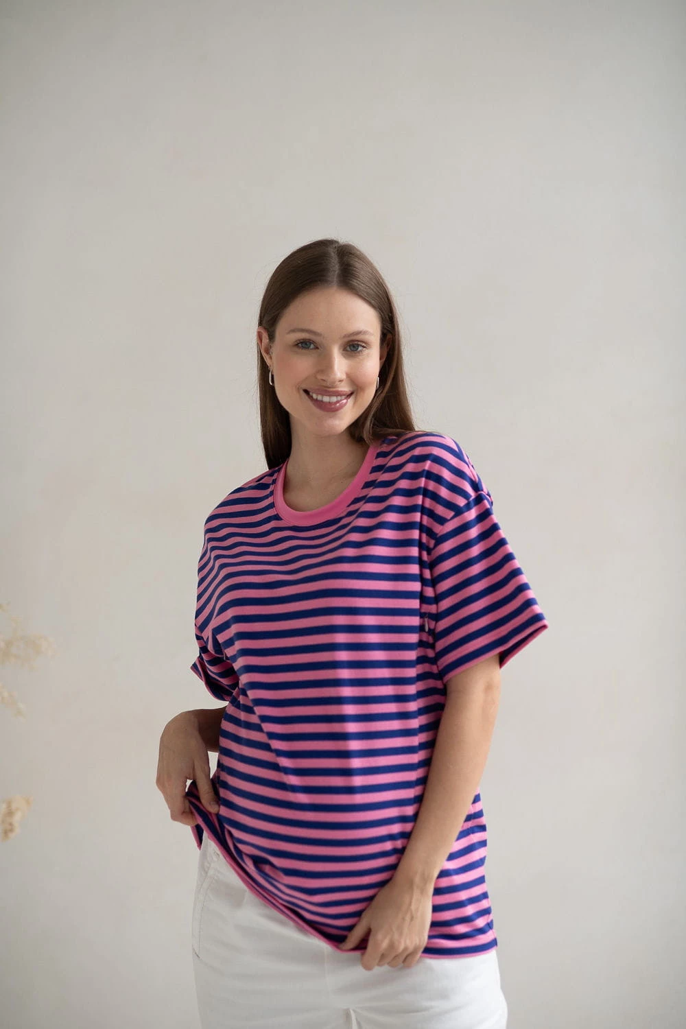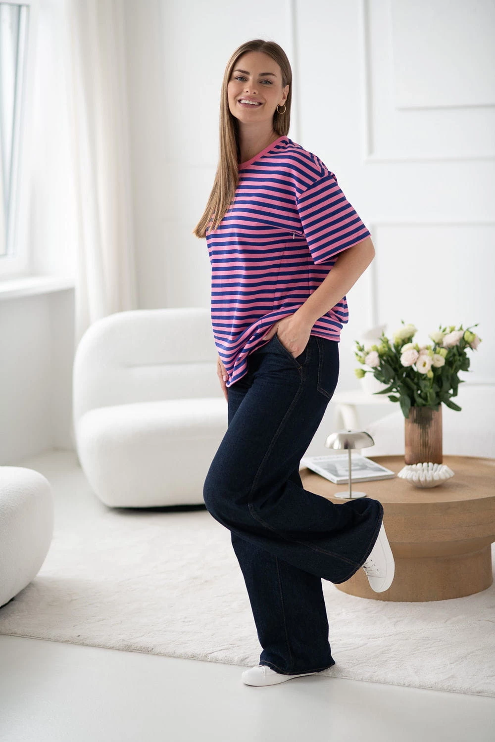 Nowoczesny wzór w niebiesko-różowe paski dodaje energii i sprawia, że t-shirt wygląda świetnie zarówno w domowym zaciszu, jak i podczas codziennych wyjść.
