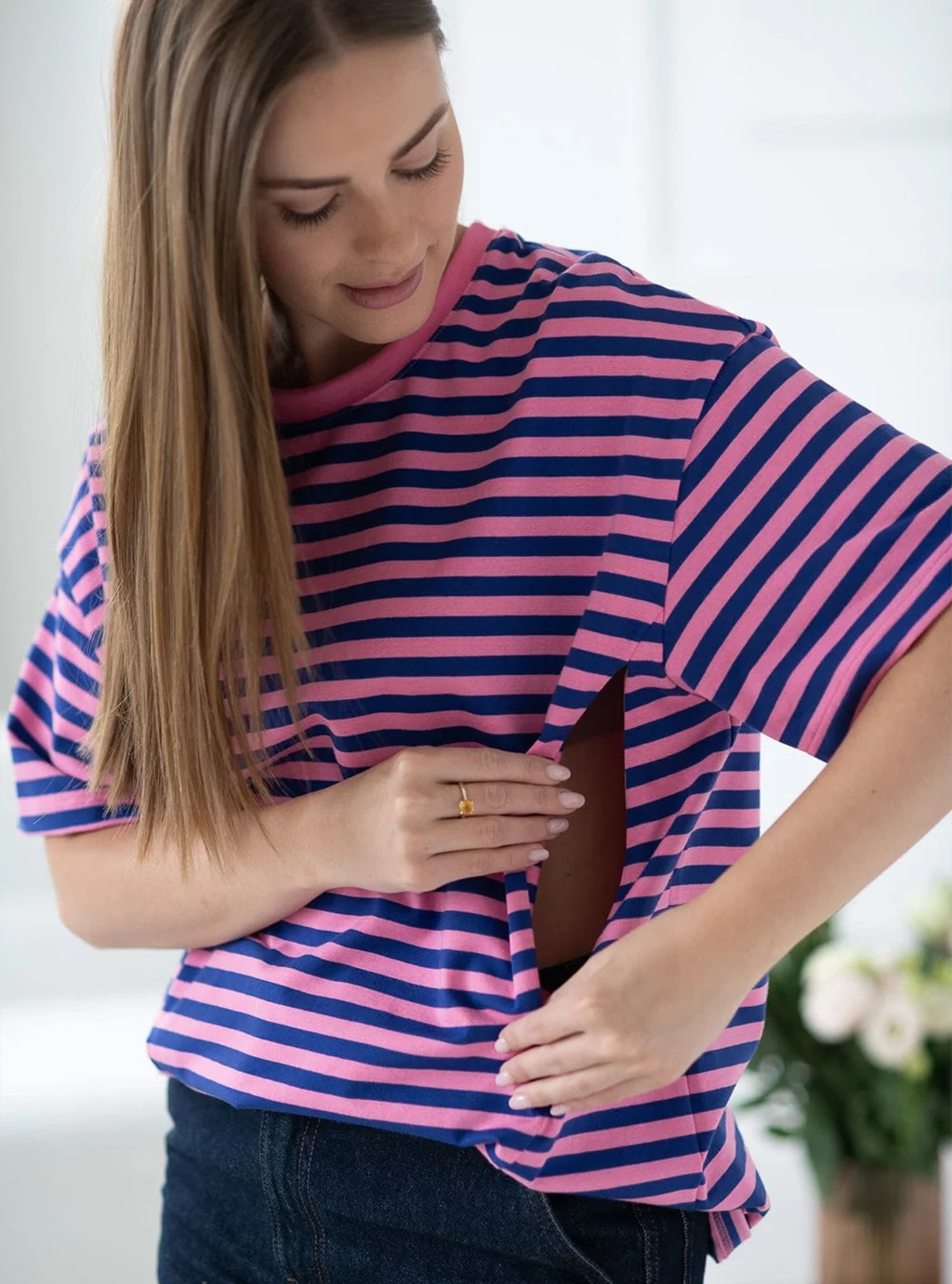 T-shirt ciążowy i do karmienia Mamahood różowo-niebieskie paski