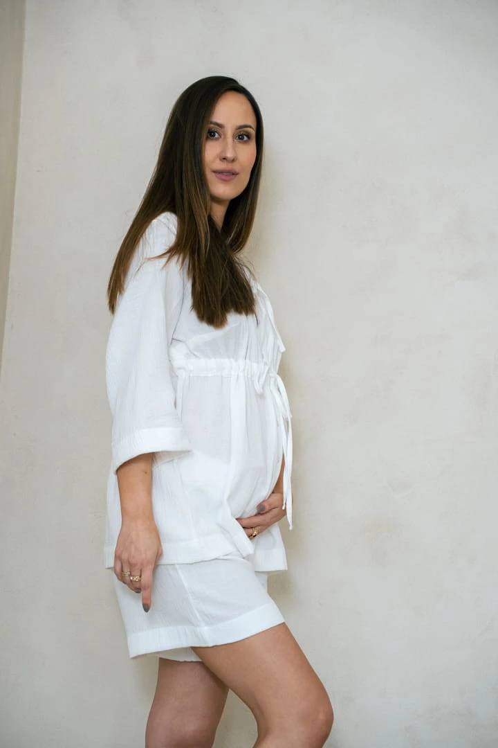 Dobierz do kompletu muślinowe szorty z regulacją pod brzuszkiem wykonane z tej samej oddychającej tkaniny, aby stworzyć komfortowy i przewiewny zestaw na lato.