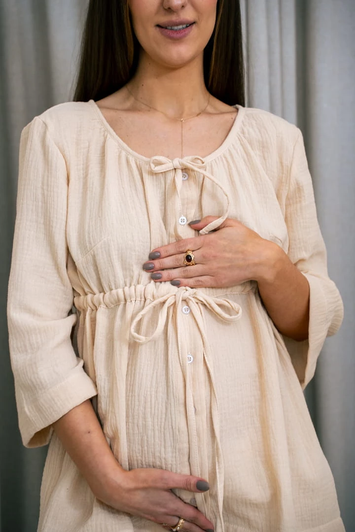 - 100% bawełna muślinowa premium – przewiewna, lekka, nie przykleja się do ciała, pozwalając skórze oddychać latem. Idealny wybór dla kobiet w ciąży oraz karmiących mam.