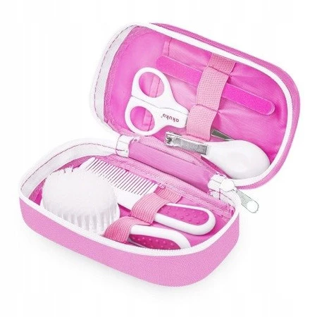 Zestaw do pielęgnacji Twojego dziecka w wygodnej i praktycznej kosmetyczce. Nożyczki (o cienkich metalowych ostrzach i zaokrąglonych krawędziach) oraz cążki pomogą pewnie i bezpiecznie obciąć drobne paznokcie, a pilniczek z łatwością usunie nierówności paznokcia chroniąc dziecko przed zadrapaniem. Natomiast miękka szczotka oraz grzebyk z antypoślizgowym uchwytem pozwolą zatroszczyć się o główkę maleństwa. W celu zminimalizowania ryzyka niespodziewanego poruszenia się dziecka, zaleca się obcinanie paznokci podczas snu. Produkt dostępny w dwóch kolorach: niebieski i różowy.
