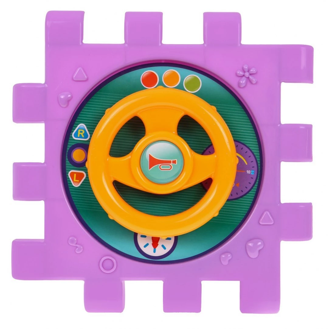 Niesamowita, składana, kolorowa edukacyjna kostka, puzzle przeznaczona jest dla dzieci już od 18 miesiąca życia. Zabawka zasilana jest bateriami typu 3 x 1,5 AAA (brak w zestawie). Klocki można łączyć ze sobą na wiele różnych sposobów, można ułożyć je w płaską matę. Każda ściana posiada inny kolor oraz funkcjonalność: 1. Jasnozielona ściana z pianinkiem (dźwięki i światła – słuch i wzrok). 2. Ciemnozielona ściana z telefonem (funkcja treningu dłoni i palców). 3. Fioletowa ściana z kierownicą (kręcenie kierownicą i towarzyszące temu odgłosy – słuch i trening dłoni). 4. Pomarańczowa ściana z drzwiami zamykanymi na klucz (rozwija myślenie przyczynowo – skutkowe). 5. Żółta ściana z trybkami do kręcenia oraz koralikami przesuwanymi na torze (funkcja treningu dłoni i palców). 6. Seledynowa oraz różowa ściana z dopasowaniem kształtu (nauka kolorów i kształtów). 7. Szara ściana z okrągłym lustereczkiem (wzrok), 8. Ściana z zegarkiem (trening dłoni i palców, wzrok) Zabawka pozytywnie wpływa na rozwój zdolności poznawczych i myślenia przyczynowo – skutkowego u maluszka. Dziecko pozna nowe kształty, kolory i dźwięki. Treningiem dla jego dłoni będzie naciskanie, popychanie i przekręcanie. Zabawka posiada elementy dźwiękowe i świetlne, które znakomicie stymulują wzrok i słuch dziecka. | |