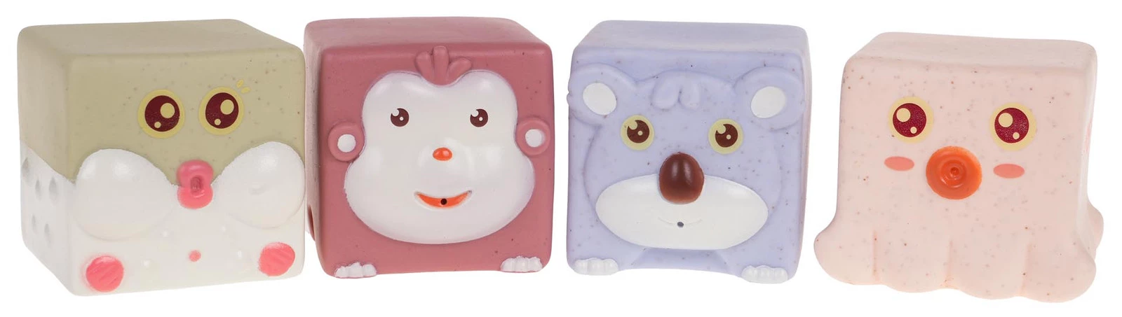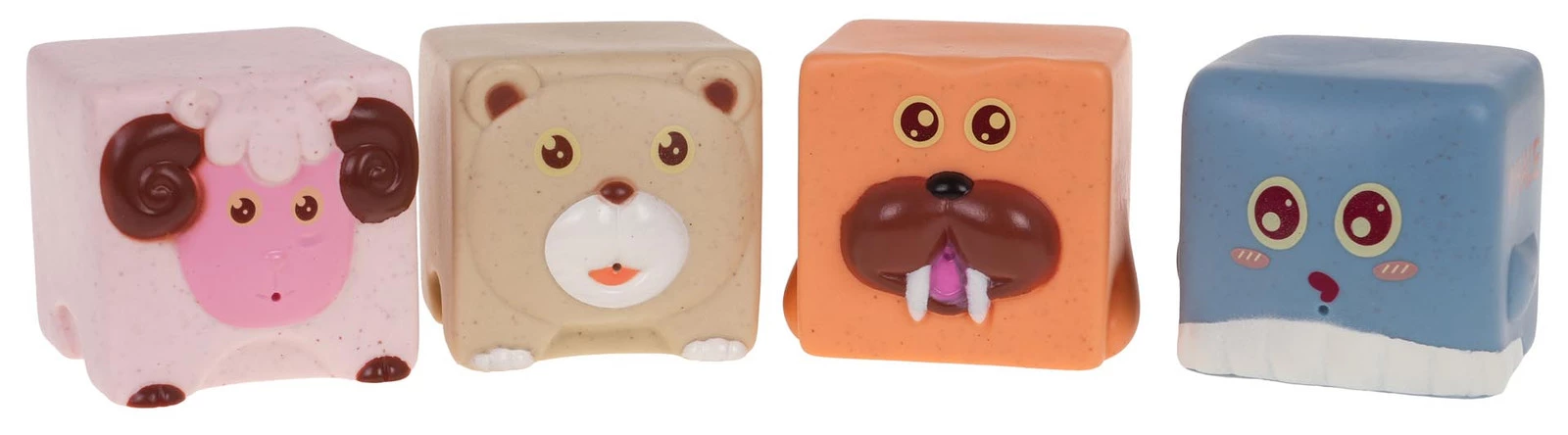 - 12 kostek ze zwierzątkami o różnych fakturach i kolorach: * ryba Fugu, * małpa, * ośmiornica, * koala, * mors, * jeleń, * miś, * owca, * rekin, * wieloryb, * tygrys, * krab. |