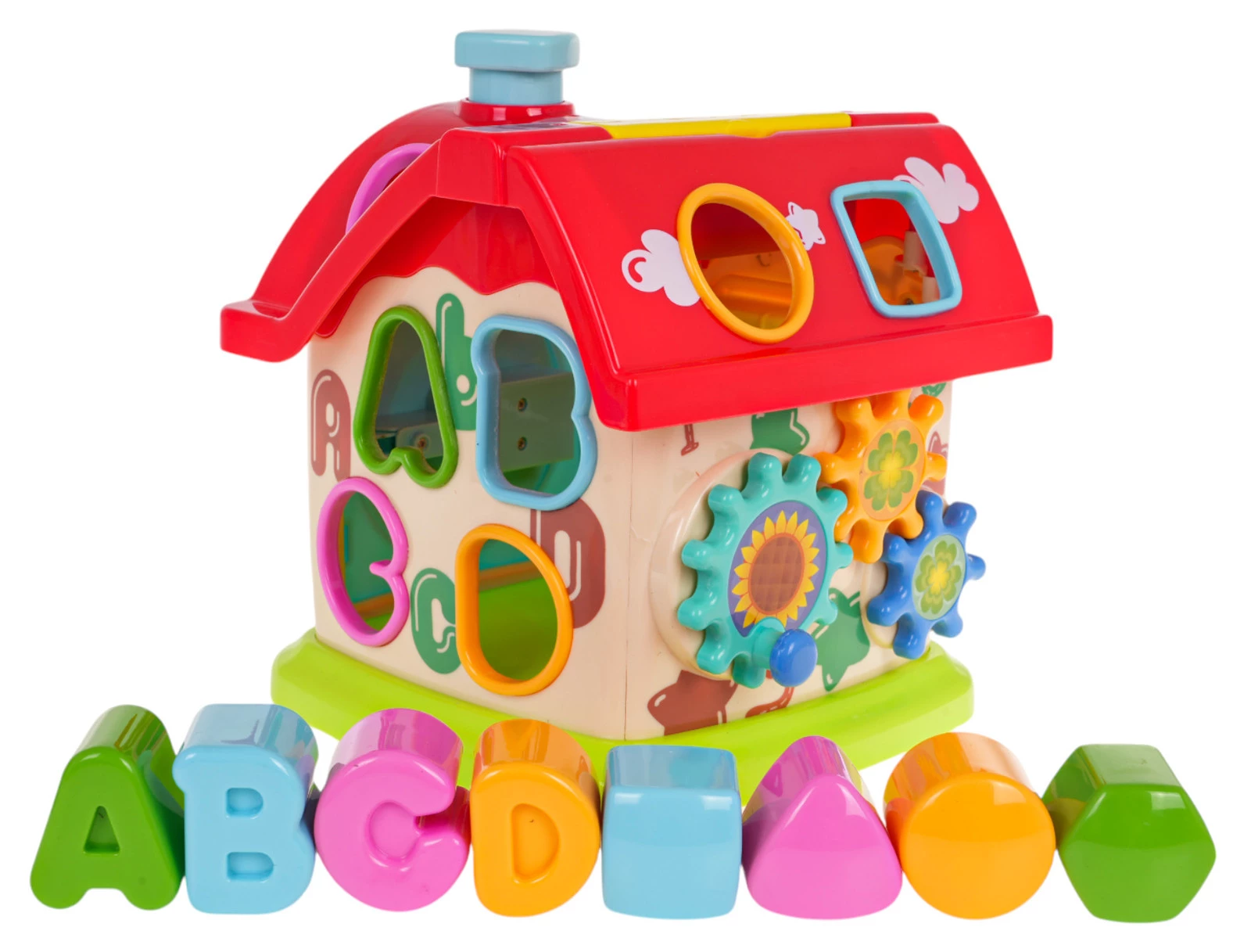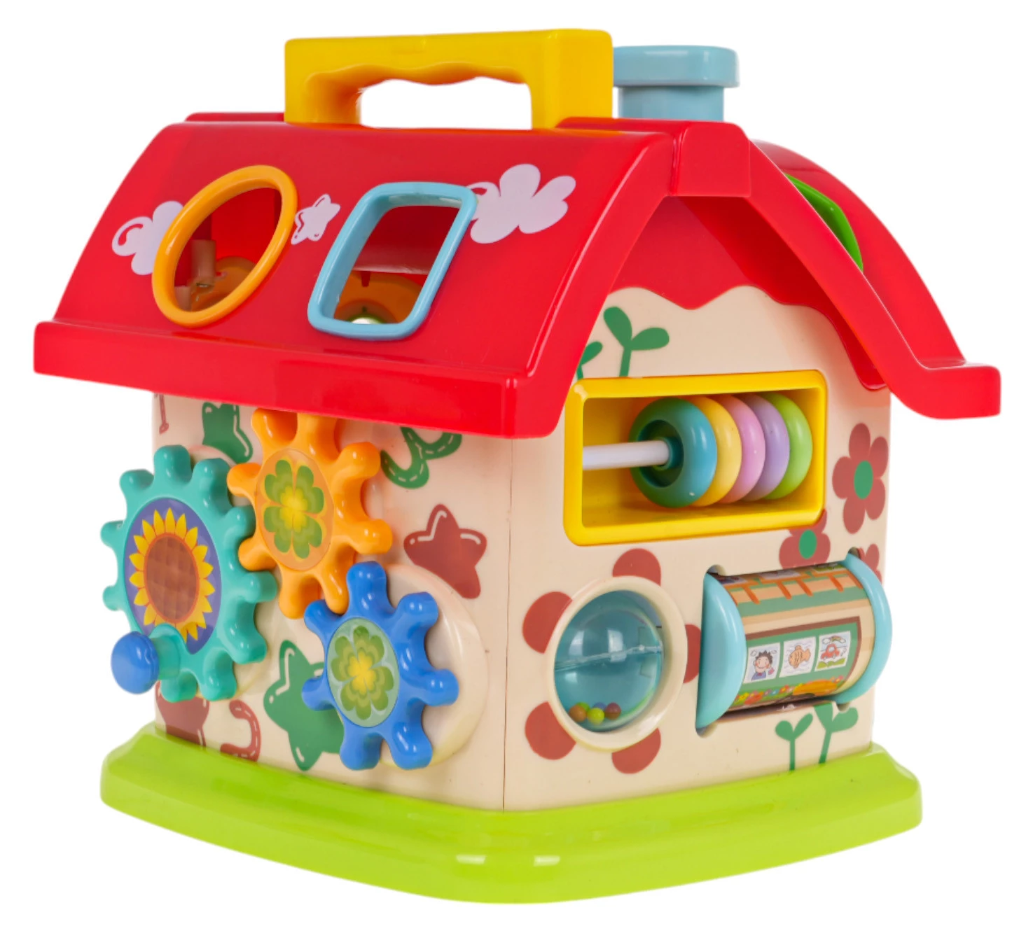 Wielofunkcyjny domek z sorterem dla dzieci od 18-go miesiąca życia. Zabawka wykonana została z najlepszej jakości plastiku w żywych kolorach zachęcających dziecko do edukacyjnej zabawy. Zabawa domkiem rozwija u dzieci funkcje motoryczne, uczy rozpoznawać kolory i kształty, rozwija orientację przestrzenną i uczy logicznego myślenia. Domek składa się z czerwonego dachu i czterech ścian. Czerwony dach W dachu znajdują się otwory, do których dziecko powinno przypasować klocki o identycznych kształtach. Aby ułatwić dziecku to zadanie, otwory posiadają taki sam kolor jak kolor odpowiedniego klocka. Jest też komin z piszczałką oraz wyciągana rączka do przenoszenia. Ścianka z zegarem Za zegarem ukryte są drzwi do domku, aby je otworzyć, dziecko musi odpowiednio ustawić strzałki. Ścianka z sorterem kształtów Na ściance znajdują się otwory w kształcie literek (A, B, C, D), dziecko musi przypasować do nich odpowiednie klocuszki. Ścianka z kołami zębatymi Maluch kręci korbką i wprawia w ruch koła zębate, które wydają zabawne dźwięki. Ścianka z liczydłem, walcem i kulką Na tej ściance znajduje się liczydło z kolorowymi kulkami, walec do obracania z rysunkami oraz kulka wypełniona perełkami, które podczas obracania kulką wydają zabawne dźwięki. Funkcje zestawu: - odpowiedni dla dzieci od 18-go miesiąca życia, - wykonany z najlepszej jakości plastiku, - żywe kolory zachęcają do edukacyjnej zabawy, - sorter kształtów z figurami geometrycznymi na dachu domku, - sorter kształtów z literkami, - ścianka z zegarem i ukrytymi drzwiami, - ścianka z liczydłem, walcem i kulką, - ścianka z kołami zębatymi, - 4 klocuszki z kształtem figur geometrycznych w czterech kolorach, - 4 klocuszki z literkami w różnych kolorach, - ćwiczy małe rączki, - uczy logicznego myślenia. |