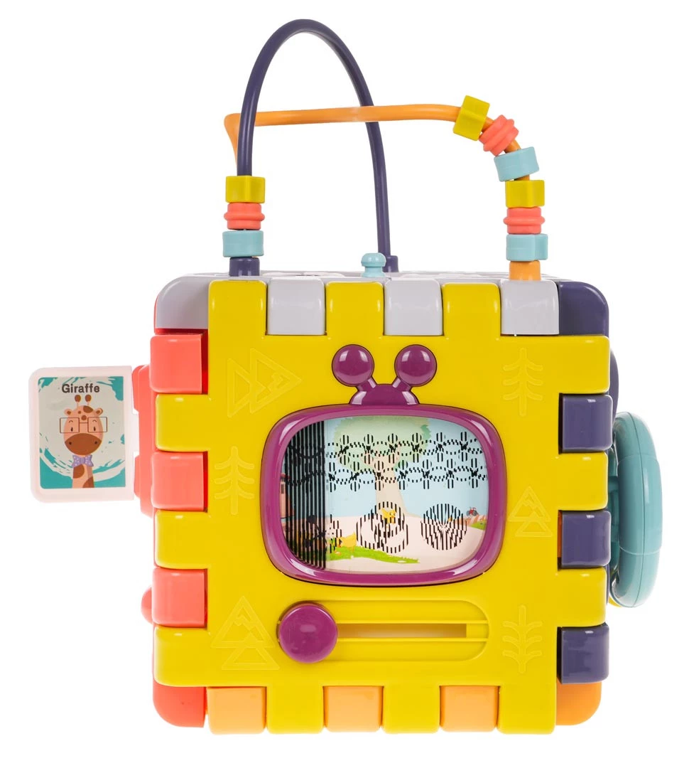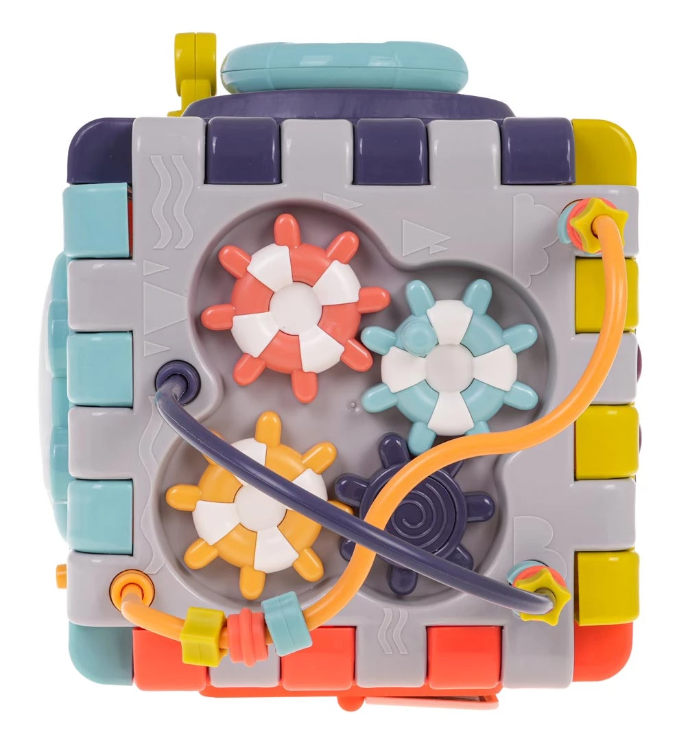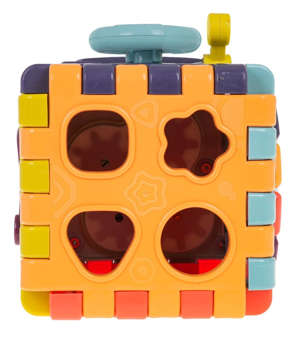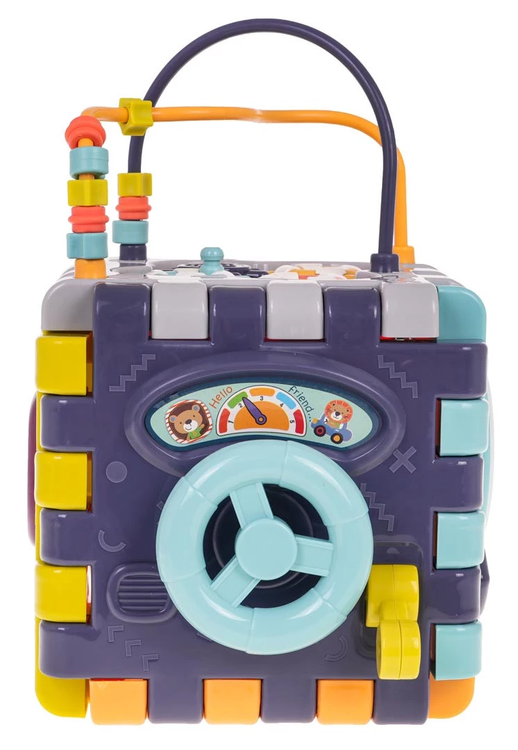 Wielofunkcyjna interaktywna kostka z efektami dźwiękowymi i świetlnymi dla dzieci od 18-go miesiąca życia. Każda ścianka boxu zapewni dziecku wiele frajdy i interaktywnej zabawy. Efekty dźwiękowe i świetlne oraz bogactwo kolorów, przyciągnie wzrok maluszka i zachęci do zabawy. Kostkę możemy rozkładać i bawić się poszczególnymi elementami na płasko. Zabawka zasilana jest bateriami typu 3 x AAA 1,5 V (brak w zestawie). Opis ścianek boksu: - ścianka z ruchomą kierownicą i ruchomą skrzynią biegów. Maluszek może poruszać kierownicą i atrapą drążka zmiany biegów.