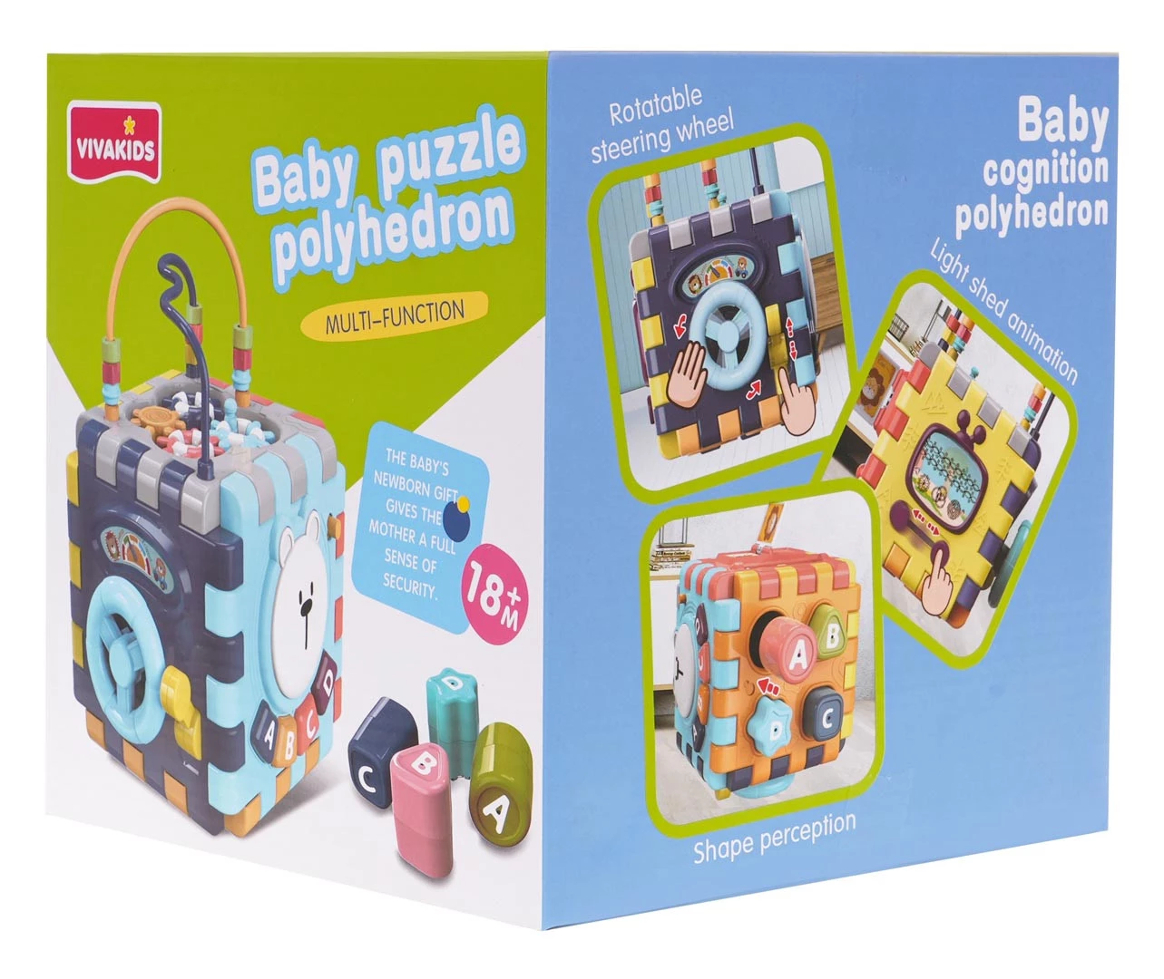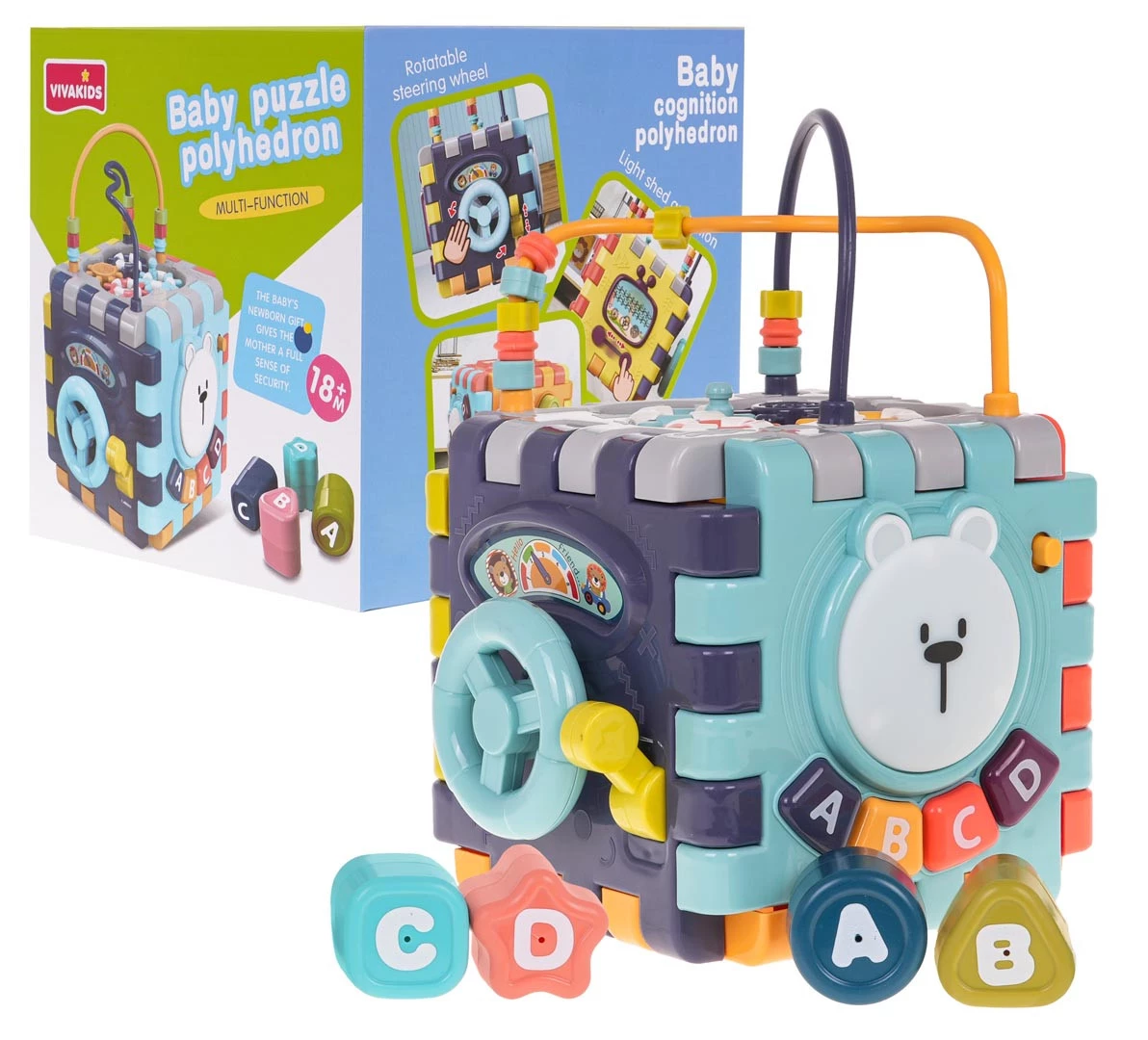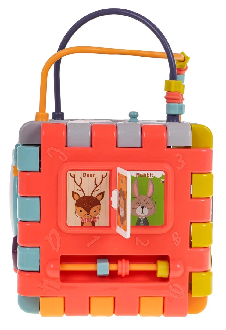 Wielofunkcyjna interaktywna kostka z efektami dźwiękowymi i świetlnymi dla dzieci od 18-go miesiąca życia. Każda ścianka boxu zapewni dziecku wiele frajdy i interaktywnej zabawy. Efekty dźwiękowe i świetlne oraz bogactwo kolorów, przyciągnie wzrok maluszka i zachęci do zabawy. Kostkę możemy rozkładać i bawić się poszczególnymi elementami na płasko. Zabawka zasilana jest bateriami typu 3 x AAA 1,5 V (brak w zestawie). Opis ścianek boksu: - ścianka z ruchomą kierownicą i ruchomą skrzynią biegów. Maluszek może poruszać kierownicą i atrapą drążka zmiany biegów.