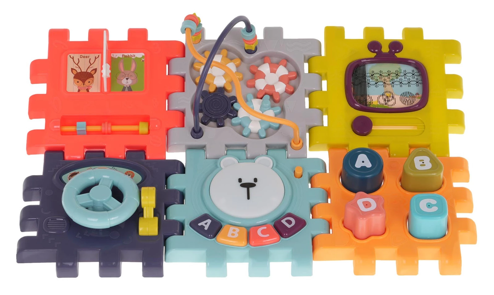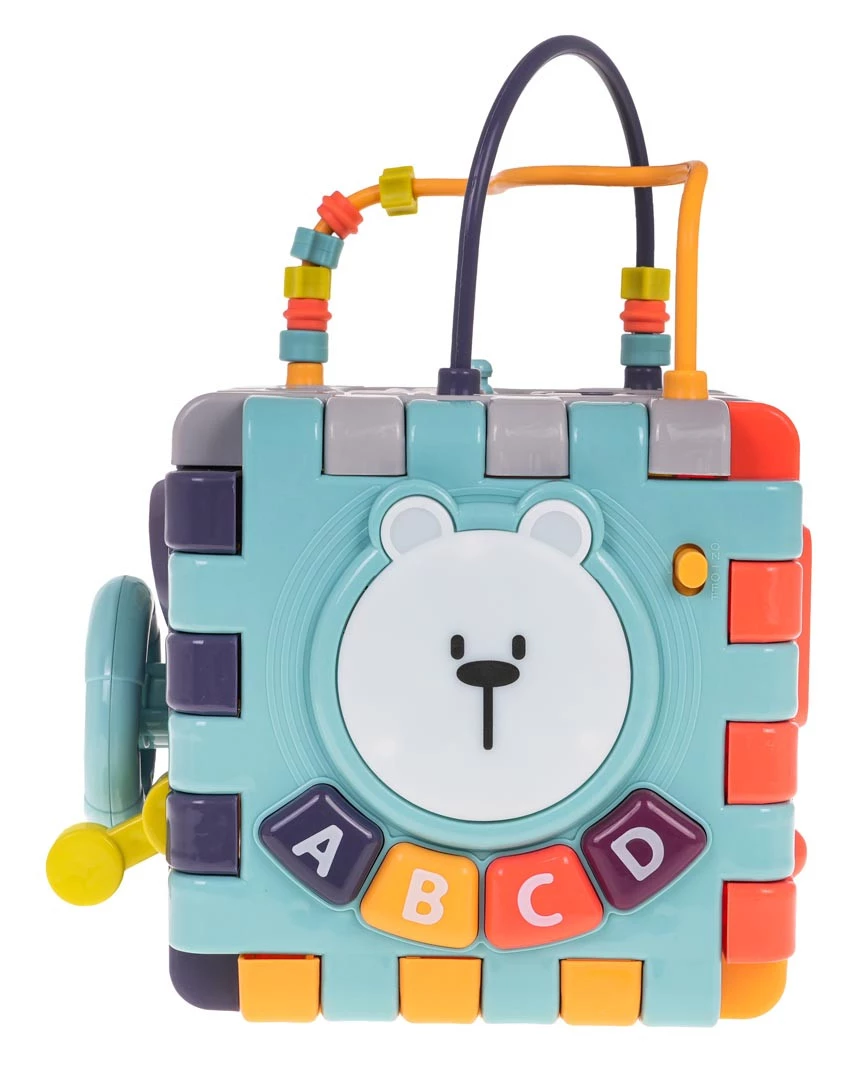 - ścianka z przekładaną książeczką i pałąkiem z ruchomymi elementami - ścianka z telewizorem i suwakiem - górna ścianka z kołami zębatymi i przekładankami Funkcje zestawu: - przeznaczona dla dzieci od 18-go miesiąca życia, - wykonana z najlepszej jakości plastiku w żywych kolorach, - boks złożony z 6 ścian, puzzli, - możliwość spinania w dowolnym układzie puzzli, - ścianka interaktywna z efektem światła (podświetlana głowa misia) i dźwięku (klawisze z numerkami i miś), - ruchome elementy: kierownica, dźwignia zmiany biegów, suwak, koła zębate, przekładane strony książki, - sorter kształtów z klockami, - klocki z grzechotką w środku. |