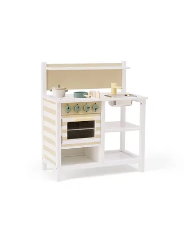 Wyposażona w otwierany piekarnik z wyjmowaną blachą, komplet garnków z uniwersalną pokrywką oraz trzy drewniane narzędzia: łyżkę, łopatkę i łyżkę cedzakową. Wszystko można łatwo uporządkować dzięki dedykowanym otworom na blacie i półce na drobiazgi. Pod blatem znajduje się dodatkowa otwarta przestrzeń do przechowywania naczyń lub akcesoriów.