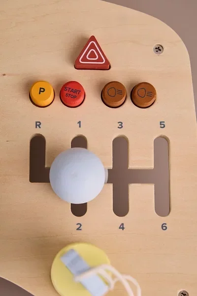 - Drewniana tablica sensoryczna w kształcie deski rozdzielczej – z kierownicą, kluczykiem, przyciskami i panelem GPS – dla maluchów od 12. miesiąca życia. Idealna do zabawy w prowadzenie auta i rozwijania motoryki.