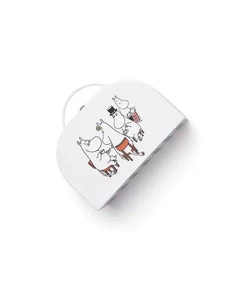 Lekka, kartonowa walizka z uroczą grafiką przedstawiającą rodzinę Muminków przy napojach. Idealna do przechowywania dziecięcych skarbów, zabawkowej zastawy czy lunchu na piknik. Bawełniany uchwyt i metalowe zamknięcie sprawiają, że dziecko może ją z łatwością przenosić.