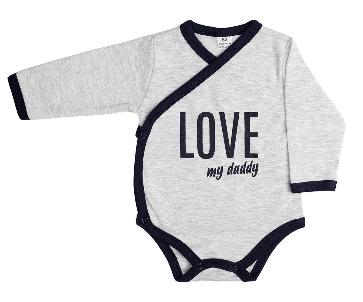 Wybierz kopertowe urocze body dla niemowląt z długim rękawem żeby Twoje dziecko było bezpieczne i odczuwało wygodę w trakcie codziennych czynności. Praktyczne bodziaki z kolekcji Love my Daddy nadają się na każdą okazję na jaką zabierzesz Swoje niemowlę. Maluszek ubierając to szare body polskiej produkcji od marki Formommy nie spoci się, ani nie uczuli wrażliwej skóry - zadba o to 100% bawełna z której wykonane jest nasze wyjątkowo miękkie body.