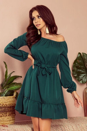 DAISY Sukienka z falbankami i paskiem w kolorze zieleni butelkowej. Na ramionach, w pasie i na rękawkach została wszyta gumka. Marka numoco. Produkcja polska.
