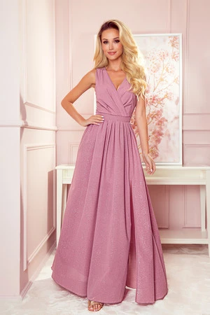 362-1 JUSTINE Długa suknia z dekoltem i wiązaniem - PUDROWY RÓŻ Z BROKATEM