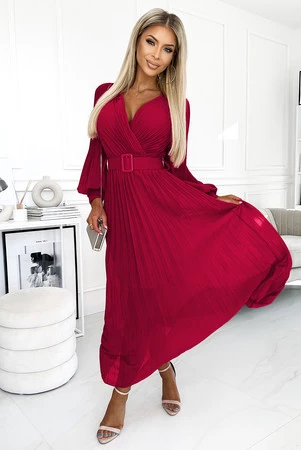 KLARA plisowana sukienka z paskiem i dekoltem - BORDOWA