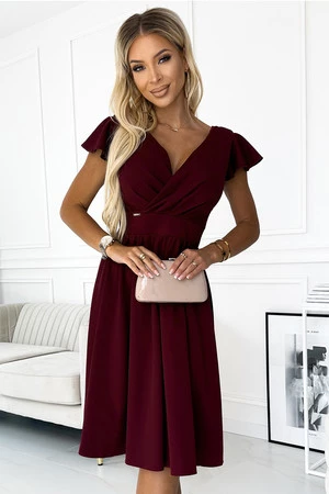 Matilde - rozkloszowana sukienka z kopertowym dekoltem i krótkim rękawkiem. Uszyta z lekko elastycznego materiału w kolorze bordowym. Marka numoco. Produkt polski.
