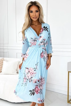 YUNA - szyfonowa plisowana sukienka midi z dekoltem i paskiem. Wzór: różowe róże na błękitnym tle. Marka numoco basic. Produkcja europejska.