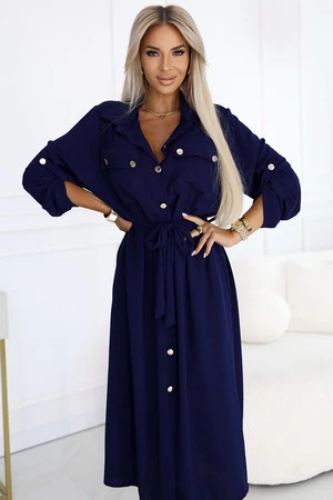 531-6 Szmizjerka midi ze złotymi guzikami i wiązaniem - GRANATOWA