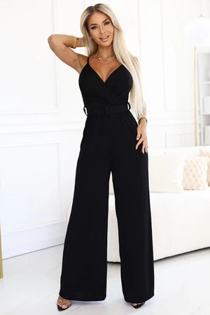 593-3 Elegancki kombinezon z kopertowym dekoltem, szerokimi nogawkami i paskiem - CZARNY