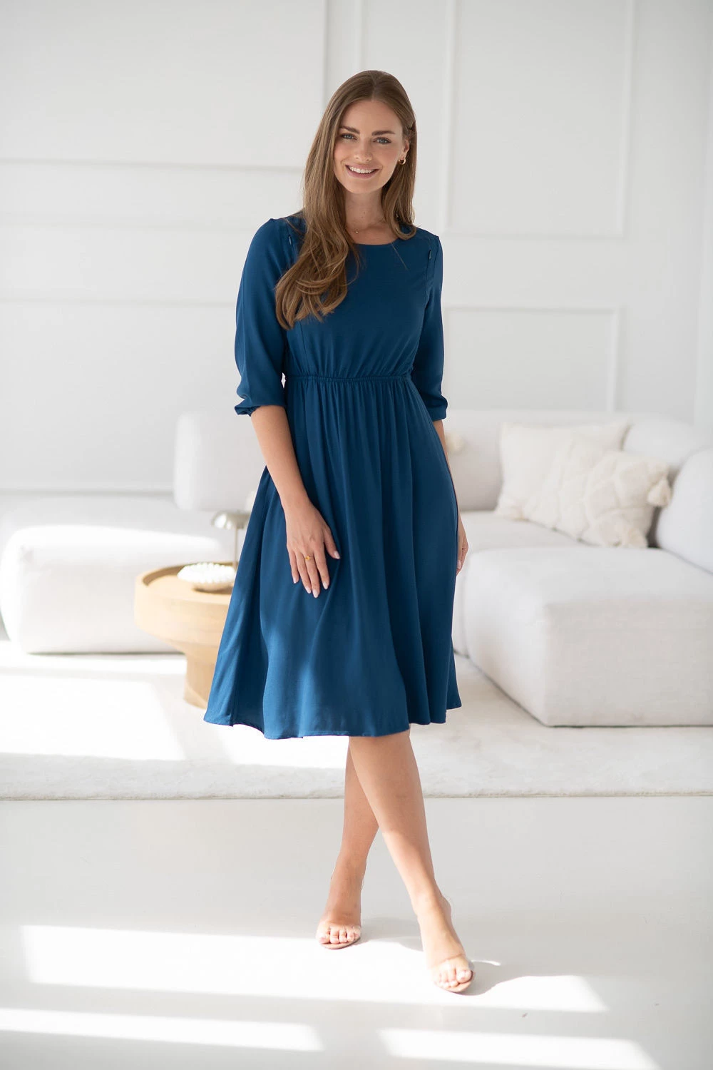 Model midi z rękawami typu bufka oraz w kolorze głębi oceanu podkreśla kobiecość i dodaje elegancji. Sukienka została uszyta w Polsce z najwyższą starannością i dbałością o detale.