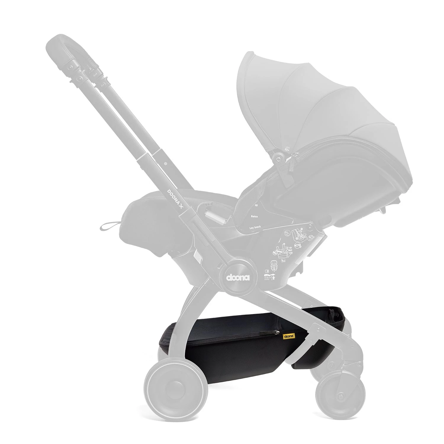 - Pojemny, specjalnie zaprojektowany kosz na zakupy, zapewnia dodatkowe miejsca do przechowywania podczas korzystania z Doona w trybie wózka.