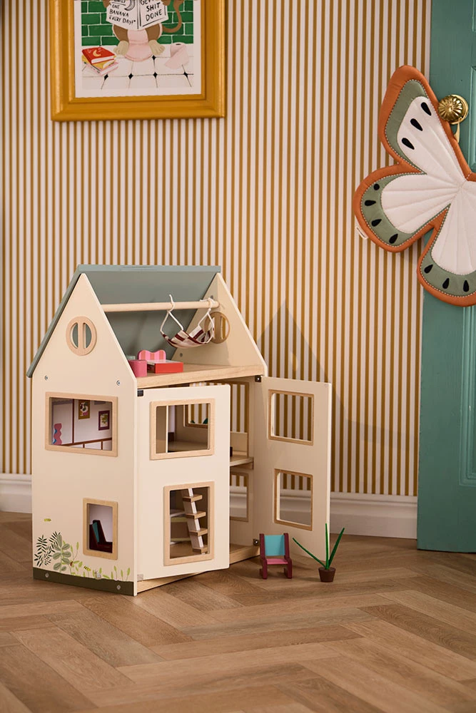 Poznaj trzypoziomowy drewniany domek dla lalek, idealny dla małych miłośników wnętrzarskich przygód. Domek ma otwierany dach, duże okna oraz frontowe drzwi, które umożliwiają swobodną zabawę z każdej strony. W ogrodzie rosną drzewa i kwiaty, które przyciągają pszczoły i tworzą spokojne miejsce na świeżym powietrzu.