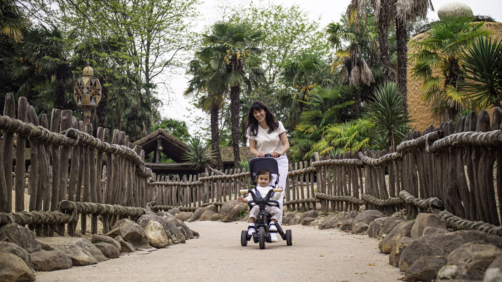 Maluch podróżuje rowerkiem z rączką, którą trzyma dorosły oraz podłokietnikiem. Dziecko uczy się samodzielnego odpychania rowerka, bez udziału podnóżka, który należy zdjąć. W razie potrzeby bez daszku UV, pedały mogą być już przesunięte do przodu (w stanie spoczynku). Pasy bezpieczeństwa nadal zapięte - dziecko podróżuje bezpiecznie.