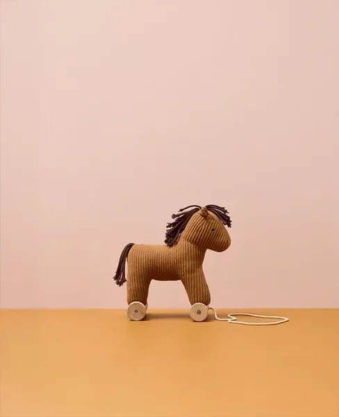 - Kid's Concept - Koń na sznurku z miękkiego sztruksu. Do ciągnięcia na spacerach lub przytulania po zdjęciu kółek. Wspiera równowagę i koordynację ruchową.