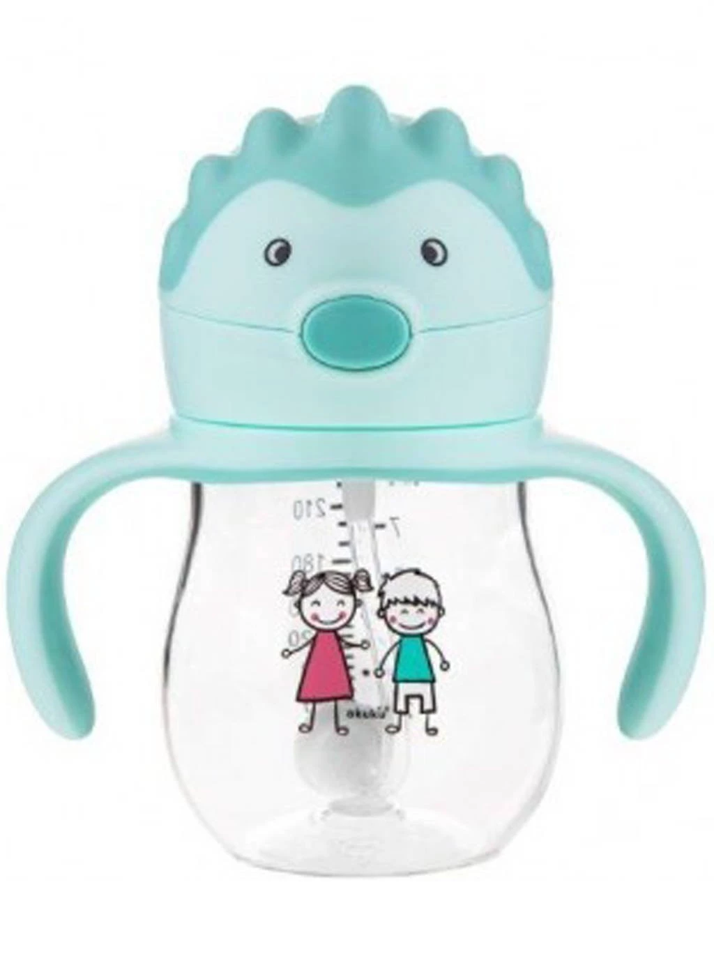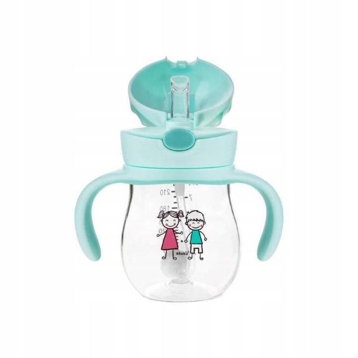 Bidon z silikonową słomką zakończoną odważnikiem umożliwia picie pod każdym kątem. Wykonany z nowoczesnego tworzywa – TRITANU, całkowicie wolny od bisfenolu A (0% BPA). Technologia ta powoduje, że bidon się nie rysuje i nie przebarwia. Jest bardzo odporny na uszkodzenia, a wyglądem przypomina szkło.  Dziecko pije do ostatniej kropelki. Twój maluszek może pić przechylając kubek nawet do góry nogami. Niezastąpiony w domu i w podróży. Szczelne zamknięcie zapobiega wylewaniu się picia i chroni słomkę przed zabrudzeniem. Wygodne otwieranie poprzez naciśnięcie guziczka. Transparentność i wyraźna podziałka pozwala na kontrolowanie ilość płynu. Kubek można myć w zmywarce na górnej półce (ale bez słomki).