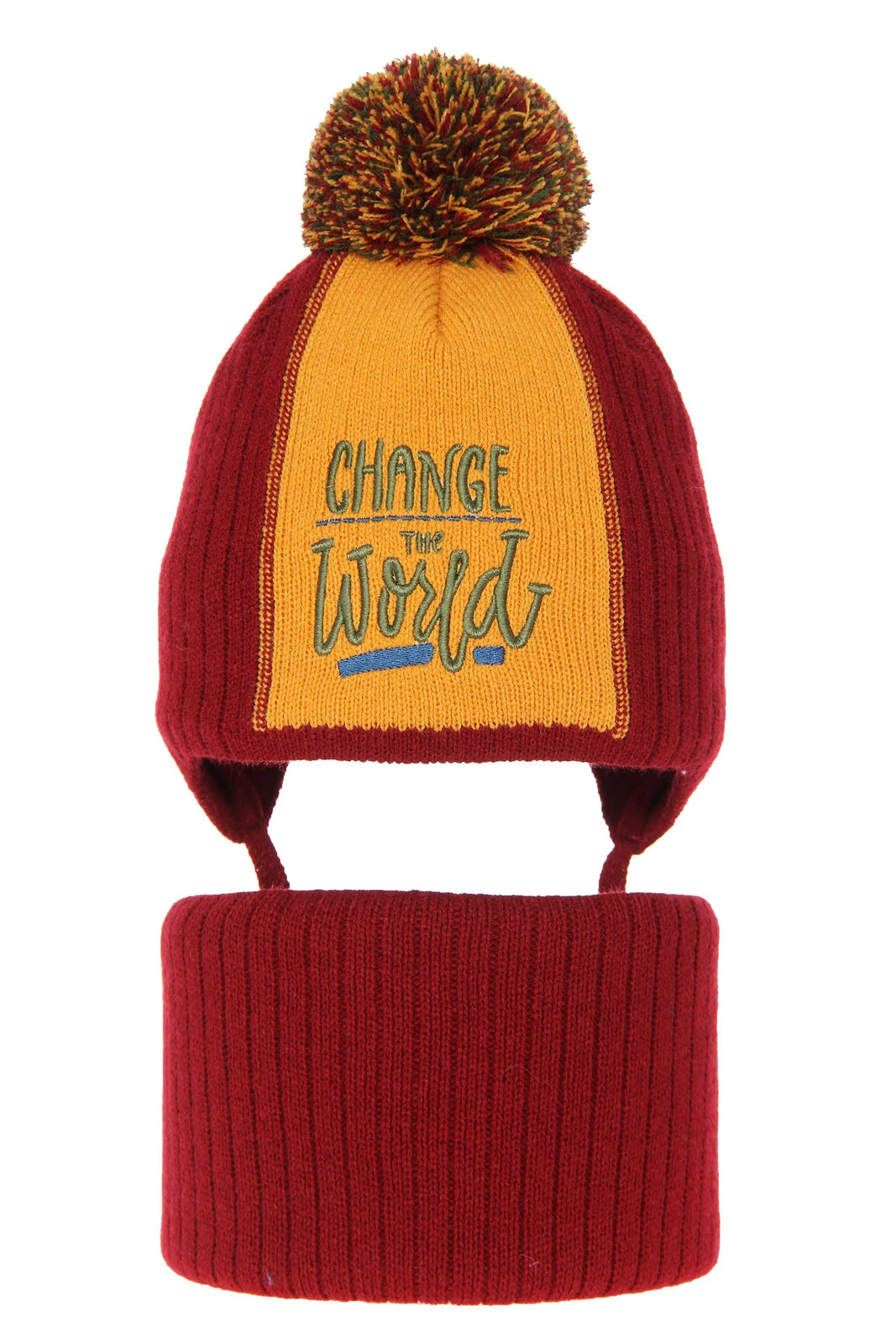 Czapka i komin dla chłopca zimowy komplet, bordowy, wiązany Herb