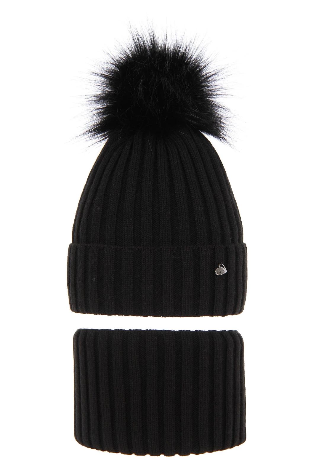 Czapka i komin dla dziewczynki zimowy komplet, czarny, z pomponem Wilma