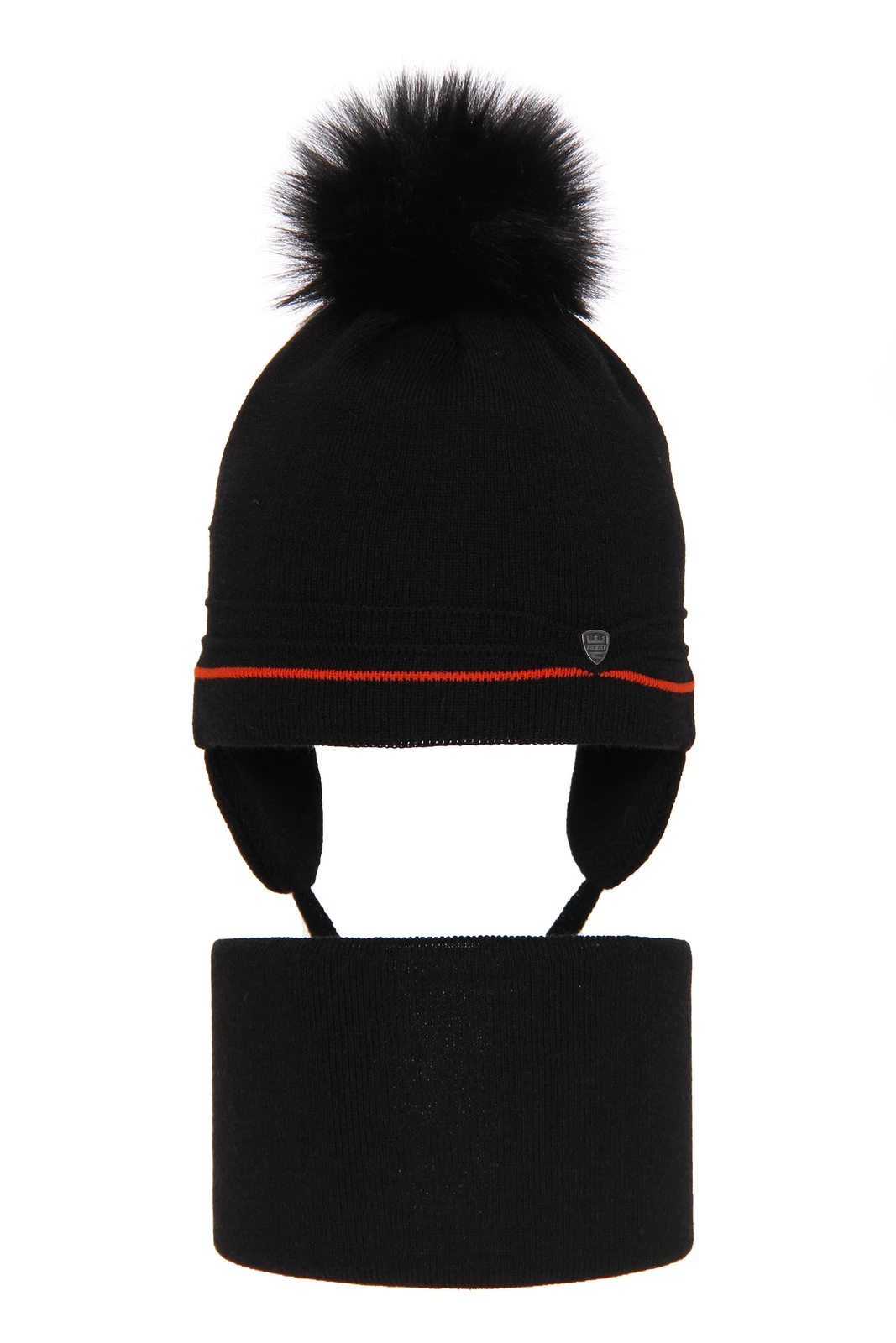 Czapka i komin dla chłopca zimowy komplet, czarny, z pomponem, wiązany Burgund