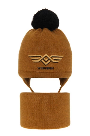 Czapka i komin dla chłopca zimowy komplet, musztardowy, wiązany, z pomponem Wings