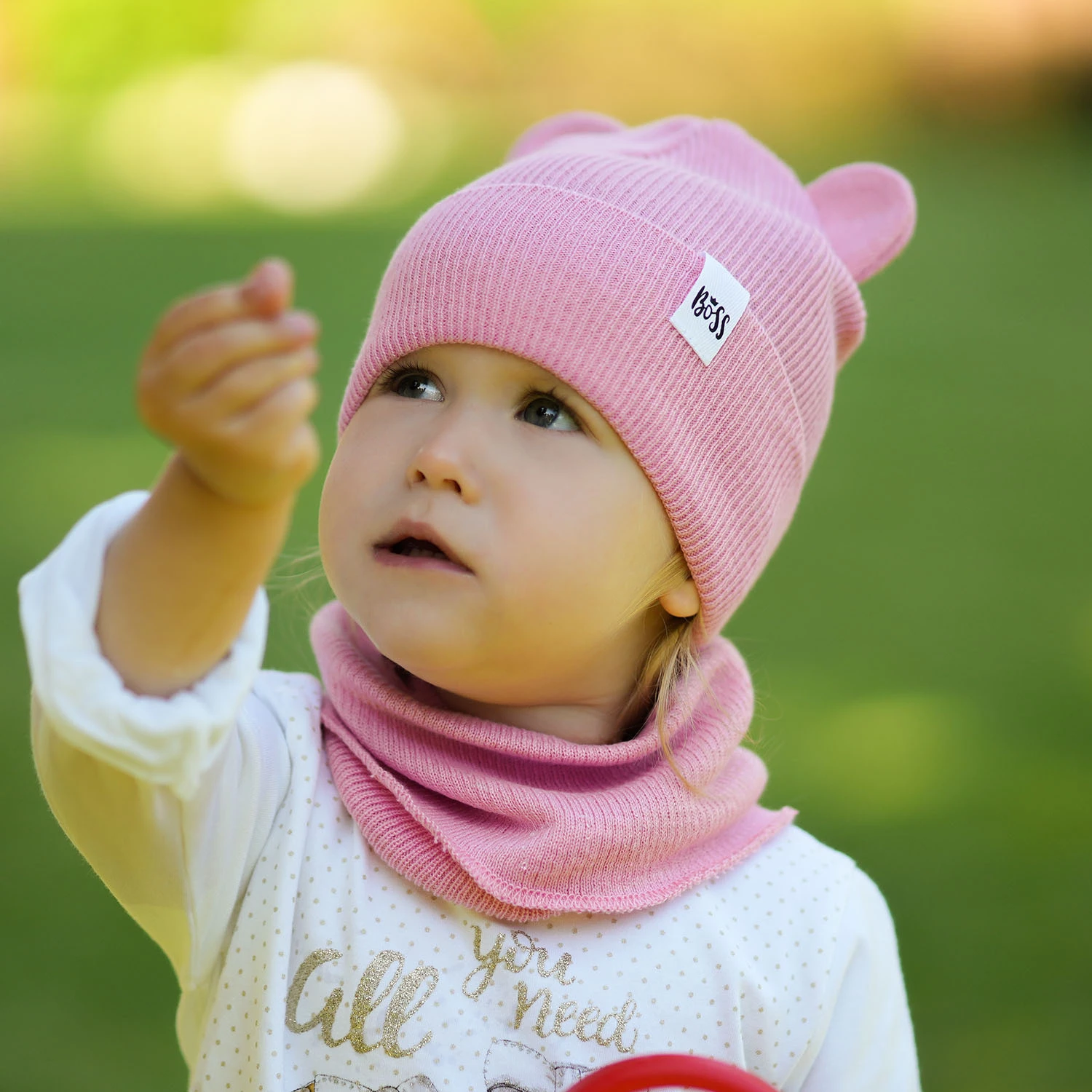 Komplet jesienny/wiosenny Kajra to nie tylko ochrona przed chłodem, ale również modny dodatek, który podkreśli charakter każdej stylizacji. Urocze uszka na czapce dodają jej dziewczęcego uroku, a stylowa naszywka "Boss" wprowadza element nowoczesności i pewności siebie – idealny dla małych, odważnych osobowości.