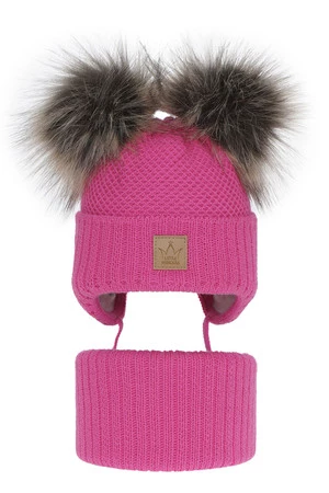 Czapka i komin dla dziewczynki zimowy komplet, różowy, z dwoma pomponami, wiązany Minsi