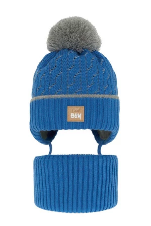 Czapka i komin dla chłopca zimowy komplet, niebieski, z pomponem, wiązany Pikolo