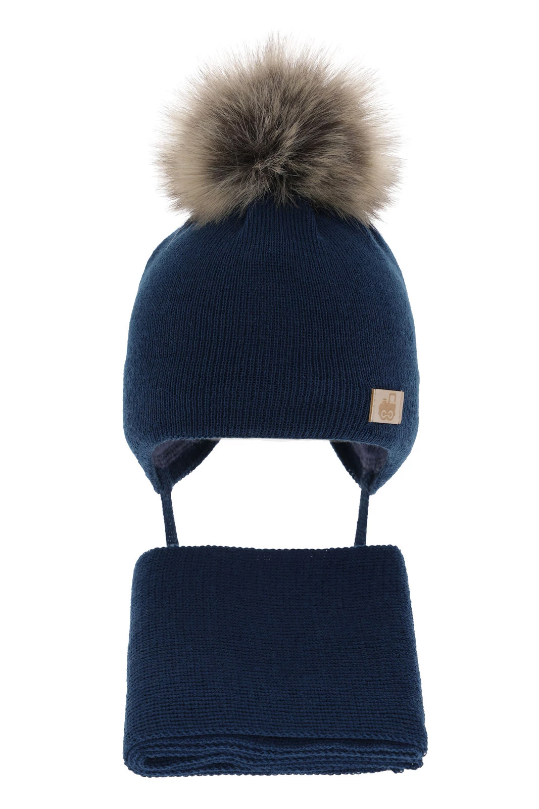 Czapka i szalik dla chłopca zimowy komplet, granatowy, wełniany merino Anastazy