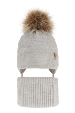 Czapka i komin dla dziewczynki zimowy komplet, szary, z pomponem, wiązany Egeria