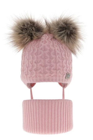 Czapka i komin dla dziewczynki zimowy komplet, różowy, z dwoma pomponami, wiązana Poliana