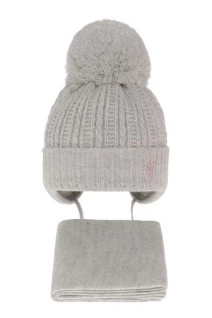 Czapka i szalik dla dziewczynki zimowy komplet, szary, wiązany, z pomponem Marisa